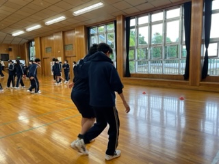 そして体育館では、リレーのバトンパスの練習、格技室では、二人三脚の練習、教室ではムカデの足のヒモの直しを行いました。