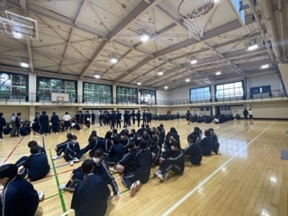 今日はあいにくの雨のため、1時間目の体育祭学年練習は、体育館、格技室、教室で行いました。