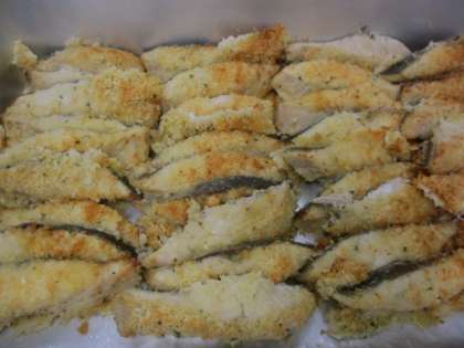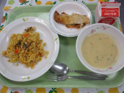 今日の魚はシルバーという白身魚です。下味をつけた魚に粉チーズとパン粉の衣をつけてオーブンで焼きました。チーズがとけてカリカリの羽つきに仕上がりました。