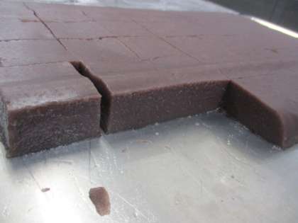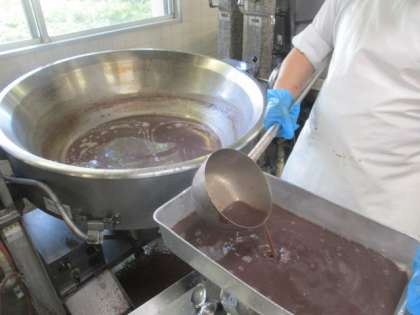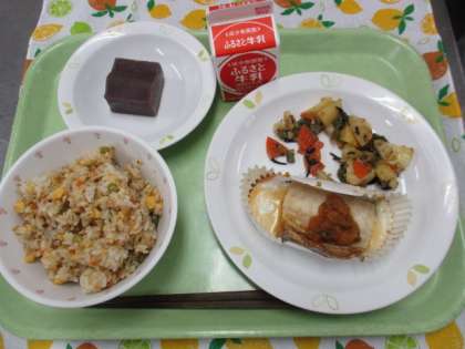 今日は和菓子の日です。それにちなみ、デザートは今の季節にぴったりな水ようかんの献立にしました。給食室で小豆を炊いてミキサーにかけ、寒天で固めて作りました。