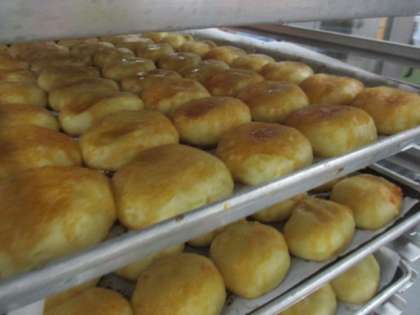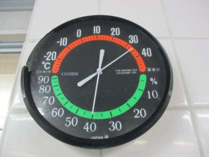 今日はとても暑い日でしたが、給食室の中もとても暑かったです。冷房をつけているのに釜前の室温は34度でした。
