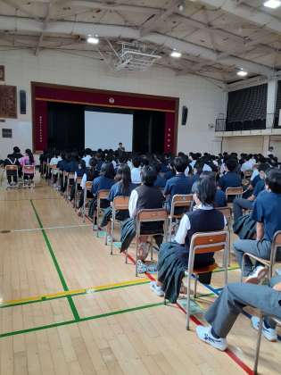 学年集会で明日の注意事項や実行委員からの話がありました。話を聞く姿勢も準備もバッチリです。