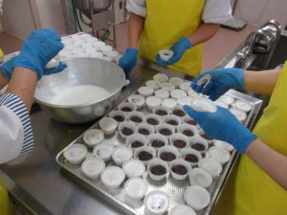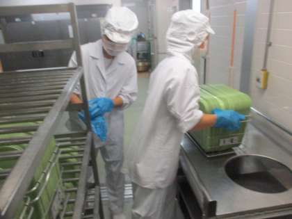 午前中は野菜の皮をむいたり食器出し、かるかんの生地を流す作業を、午後は食器の洗浄作業を体験しました。
