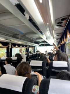 待ちに待った河口湖連合移動教室が始まりました!今、仙川劇場前を出発しました。まず、富士ミルクランドに向かいます。写真はお見送りに来てくださった保護者の皆さんに手を振っています。皆さんいい表情です!