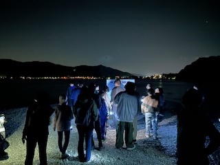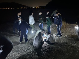 みんなでランタンをもって夜の湖畔を散歩しました。星空がとても綺麗でした。