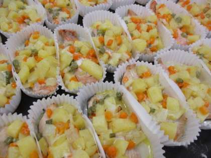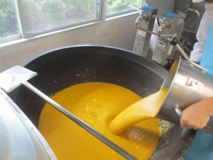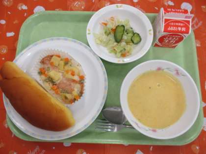 10月10日は「目の愛護デー」です。そこで今日は目にいい食べ物を取り入れた献立です。鮭には紫外線などから体を守る「アスタキサンチン」がたくさん含まれています。また、パンプキンパンとキャロットポタージュには、目の健康を保つビタミンAが豊富です。
