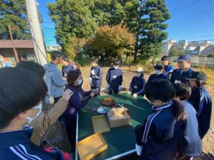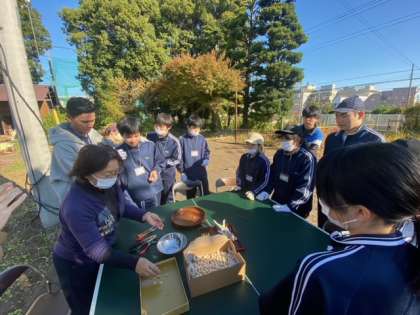 銀杏の殻むきについて説明を受けています