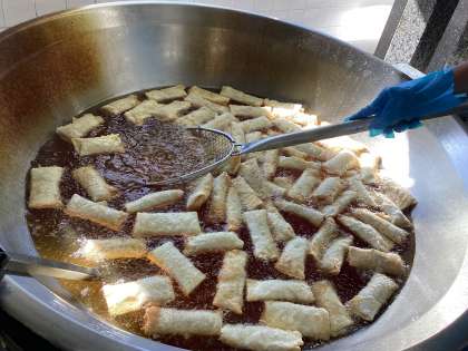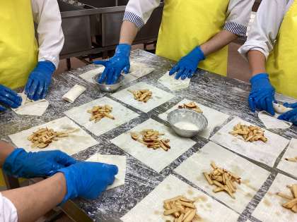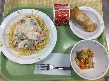 今日のアップルパイはパイ生地で包んで焼くのではなく、ファーストフード店風に春巻きの皮にりんごを包んで油で揚げて作りました。みんなとてもよく食べていました。