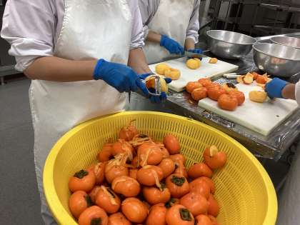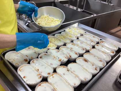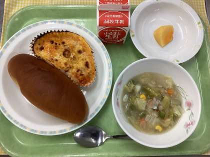 豆腐のグラタンは、ミートソースと合わせた豆腐の上にホワイトソースをのせ、その上にチーズをかけてオーブンで焼いて作りました。みんな完食でした!