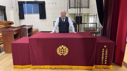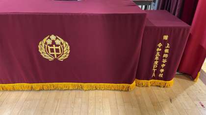 サイズをぴったりでオーダーメイドのカバーとなっております。正面に校章もあり立派なものとなっております。皆様にお披露目できるのは次は卒業式です。ぜひ楽しみにしていてください。PTAの皆様本当にありがとうございます。この先も上祖師谷中学校が長く発展するためにも大切に扱わせていただきます。