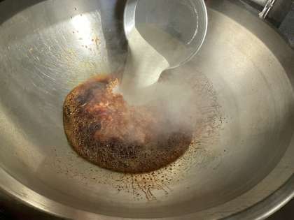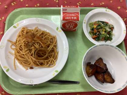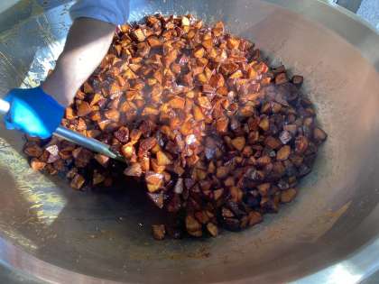 キャラメルポテトは素揚げしたさつまいもにキャラメルソースを絡めた、洋風の大学芋のような料理です。キャラメルソースは給食室での手作りで、砂糖を溶かして濃い褐色になるまで高温で加熱してカラメル状になったら、生クリームを加えます。とても好評で、全クラス完食でした。