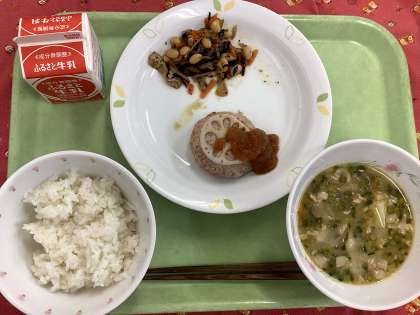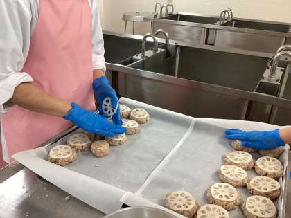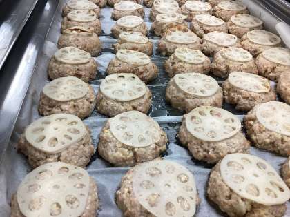 れんこんバーグは、すりおろしたれんこんとみじん切りのれんこんをハンバーグ生地に混ぜ、さらに上にスライスしたれんこんをのせてオーブンで焼いて作りました。れんこんを色々な食感で楽しめるハンバーグです。大根おろしのソースをかけていただきました。