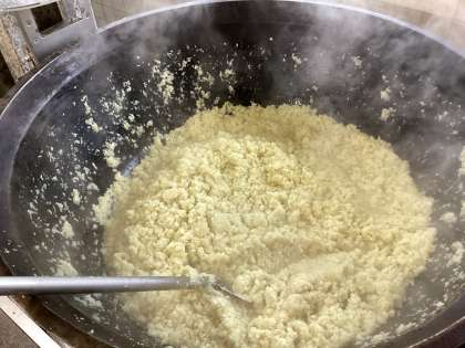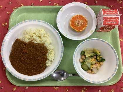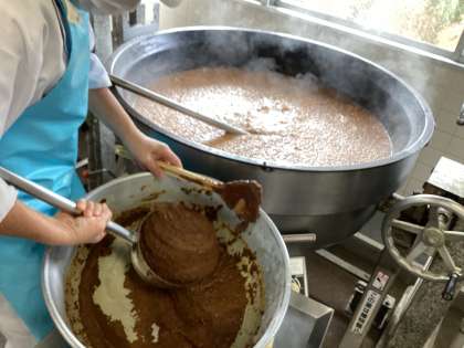 給食のカレーは、玉ねぎをじっくりと炒めて甘みを引き出します。今日のカレーには48キロの玉ねぎを使っています。ルーは給食室で作ったブラウンルーを入れて仕上げます。
