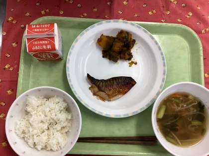 22日が冬至ですが明日で給食が終わりになるので、少し早い冬至献立です。冬至といえばゆずとかぼちゃなので、ゆずを使った幽庵焼きとかぼちゃのいとこ煮をつくりました。