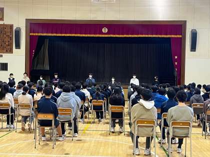 【3学年】学年集会 公開日 2023/12/22 更新日 2023/12/22 おしらせ 各クラスの学年委員から、2学期の振り返り、3学期に向けての話がありました。 修学旅行、音楽祭を通して、「始めよう、自分から」という学年スローガンを意識して動けるようになってきた、これから受験が近づいてきて自分のことばかりになりがちだが、周りの人への配慮や、日常生活を大切に過ごそうという話がありました。 いいね(0)