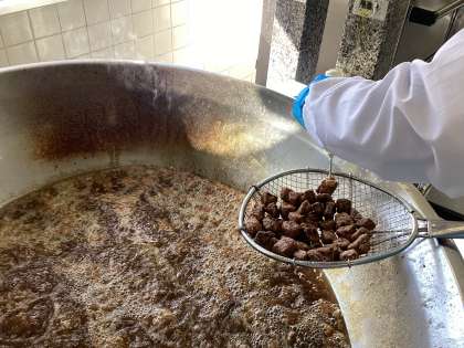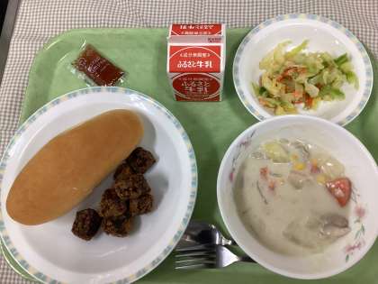 学校給食週間2日目は、おじいちゃん・おばあちゃん世代の給食を再現しました。戦後はくじらの肉を使ったメニューがよく出ており、下味をつけて油で揚げた「くじらの竜田揚げ」は給食の人気メニューでした。またこの時代は米飯給食がまだ導入されていなかったため、主食はパンがほとんどで、コッペパンにジャムがつくのが定番でした。
