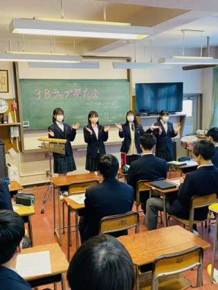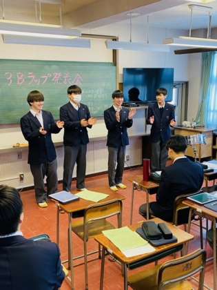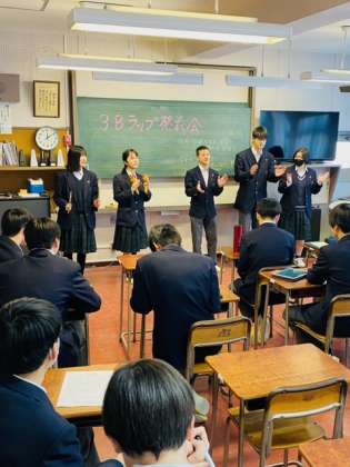 3年生は2学期から創作活動を行ってきました。この3年間の思い出を題材にして歌詞を創り、ラップのリズムにのせて発表するというものです。体育祭、修学旅行、音楽祭、日々の学校生活が思い出される発表会でした。
