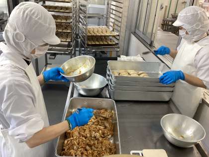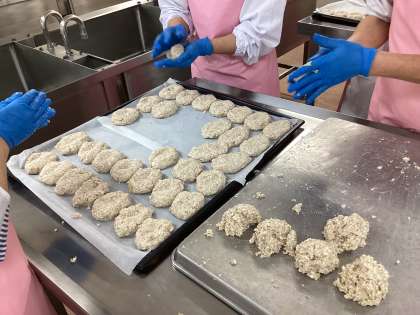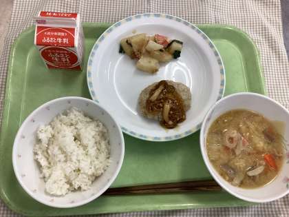 今日のハンバーグは、ひき肉と同量の豆腐を混ぜて作った豆腐ハンバーグです.豆腐が入ることにより柔らかい食感のハンバーグになりました.また、豆腐を入れるとお肉だけのものよりもカロリーが低くなるのでヘルシーです。