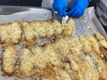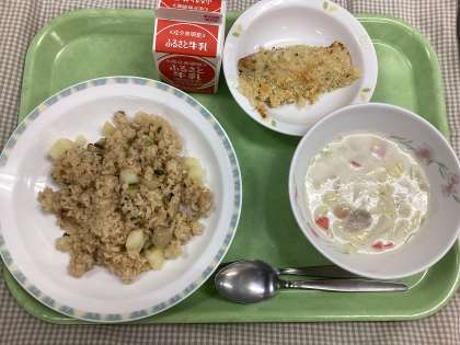 白身魚のチーズパン粉焼きは、下味をつけた魚にパン粉と粉チーズを合わせた衣をつけてオーブンで焼きました。衣のチーズが溶けて餃子の羽のようにパリパリとなり、魚嫌いの子も食べやすかったようです。ベーコンとじゃがいものにんにくライスは、にんにくバター醤油のパンチのきいた味付けが好評で、こちらもよく食べていました。