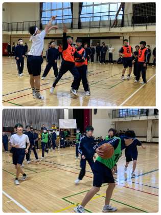 第1学年スポーツレク大会、体育館では男子のバスケが始まりました。