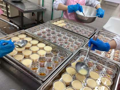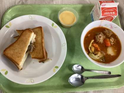 今日のデザートは、給食室でカラメルソースから手作りしたプリンです。新しくなったオーブンで初挑戦でしたが、今までよりも滑らかな蒸し上がりでとても美味しかったです。ホットサンドは、エリンギ・しめじ・マッシュルームと3種類のきのことベーコンをソテーした具とチーズを挟んでオーブンで焼きました。