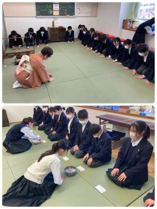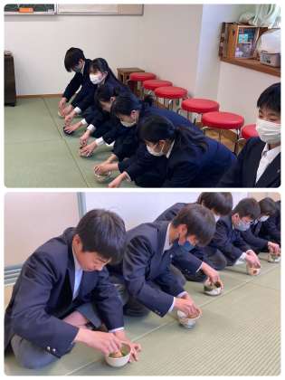 【第1学年】日本文化体験 茶道 公開日 2024/03/08 更新日 2024/03/08 おしらせ 1年生の日本文化体験、茶道では、茶道の歴史について学んだ後、座り方、お茶の立て方などを体験しました。 そして最後にお茶菓子と自分たちで立てたお茶をいただきました。お茶は思ったより苦くなく、美味しくいただけたようです。とても良い体験になりました。 いいね(0)