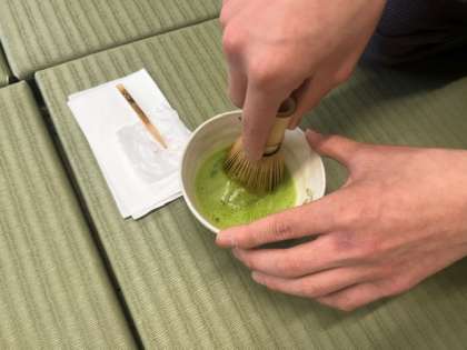DVDを見て作法を学び、実際に畳の上でお茶をたてました。