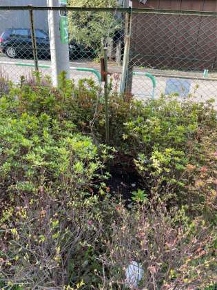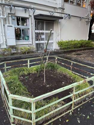 樹木の病気によりこのまま枯れてしまうと思ったのですが、今まであったさんざしは根元は生きていますので、株分けをして正門前に植えてあります。また、親株は校庭に面したところに移植させていただきました。