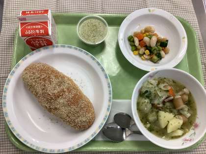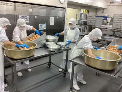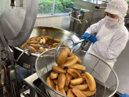 今日は大人気の揚げパンの献立です。パンは油を吸いすぎないようサッと短時間で揚げていきます。デザートは、八十八夜にちなんでお茶を使ったデザートです。立春から数えて88日目の今日を八十八夜といい、茶摘みが最も盛んになる時期で新茶が出回ります。春から夏に移る節目の日で縁起のいい日とされており、古くから日本人の生活の中に溶け込んでいます。
