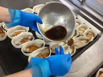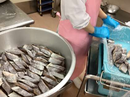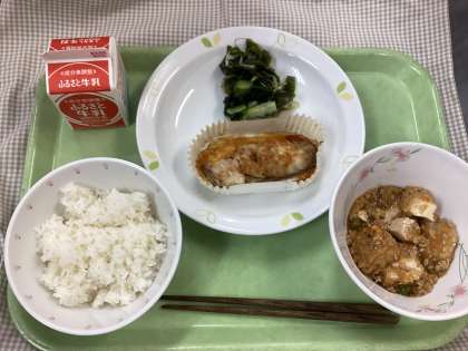 今日の魚はミナミカゴカマスという白身魚です。秋口の脂ののったサワラに味が似ていることから「銀サワラ」とも呼ばれています。今日は焼いた銀サワラの上にたまねぎじょうゆのソースをかけた献立です。油・酢・砂糖・しょうゆとおろしたまねぎを合わせて一味唐辛子をアクセントに加えたソースはとても好評で、いつも残ることが多い魚料理も今日はほとんど残らず食べてくれていました。