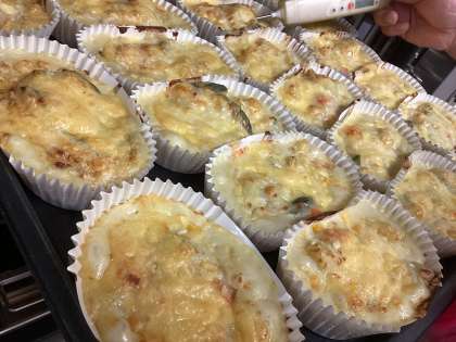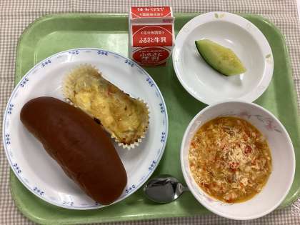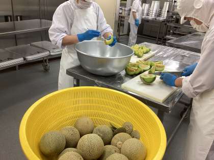今がおいしい時期の新じゃがとアスパラガスをホワイトソースに包んでグラタンにしました。ホワイトソースは豆乳に米粉でとろみをつけて作ったもなので、乳製品アレルギーの子もみんなと同じ料理を食べられます。メロンは茨城産のアンデスメロンです。ちょうど食べ頃に熟していました。