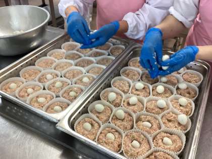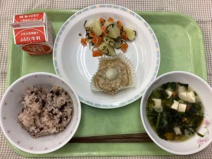 今日は上祖師谷中学校の開校記念日なので、お祝いにお赤飯の献立にしました。鶏肉のつくね蒸しは、鶏ひき肉に大豆・豆腐・高野豆腐に味噌と大豆製品をたくさん混ぜ込んだ、栄養たっぷりのつくねです。上にうずら卵をのせてアクセントにしました。
