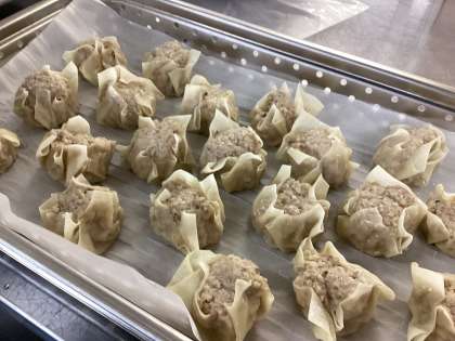 しゅうまいは点心料理といって間食や軽食の食べ物になるので軽く食べられるサイズが多いですが、給食では小さいのを何個も作る時間がないので、10センチ四方の皮を使った食べ応えのあるジャンボサイズを作りました。