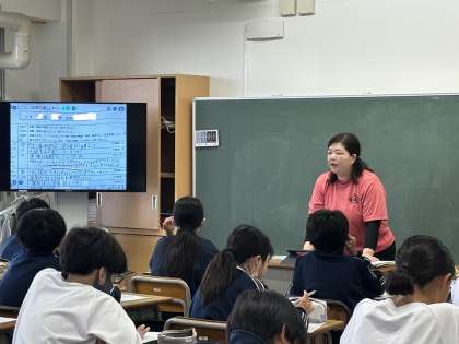 1年生の社会科の授業で、振り返りシートの説明をしていました。