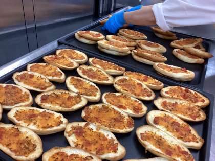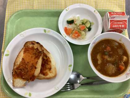 ブルスケッタはイタリア料理の軽食の一つです。本来は、薄くスライスしたパンをカリッとトーストして、色々な具をのせて食べます。給食では、ソフトフランスパンにオリーブオイル、にんにく、トマト、ツナを混ぜた具をのせてオーブンで焼いて作りました。