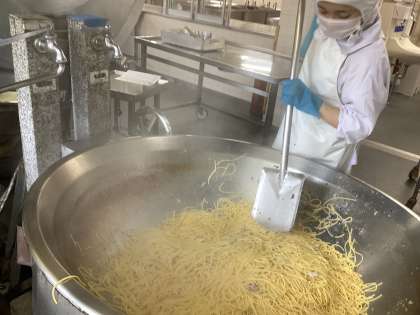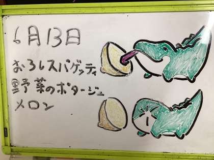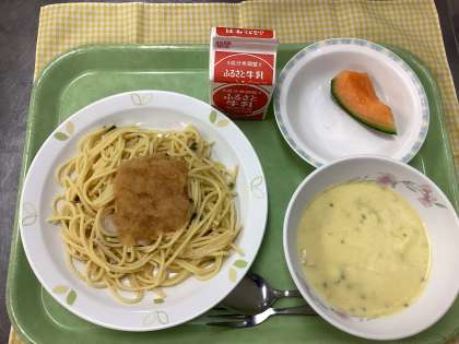 今日はおろしスパゲティの献立です。たまねぎ、鶏肉、小葱を炒めて調味した具と茹でたスパゲティを混ぜて、上にすりおろした大根と調味料を合わせたおろしソースをかけていただきます。さっぱりと食べやすい味でみんなよく食べていました。
