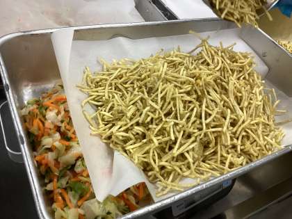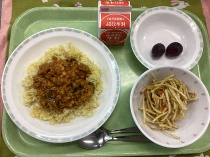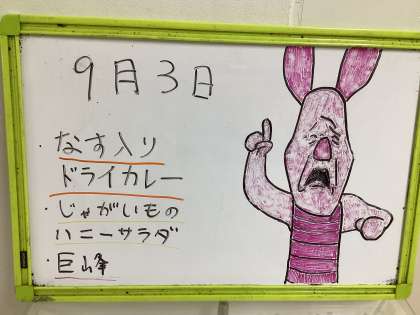 今日から2学期の給食がスタートしました。最初の給食は、久々なので配膳が簡単にできるようドライカレーとサラダの献立です。じゃがいものハニーサラダは給食で大人気の料理で、はちみつ入りドレッシングで和えた野菜とカリカリに揚げたじゃがいもを混ぜ合わせたサラダです。じゃがいもをカリカリの食感のまま教室へ届けられるように、野菜の上にクッキングシートをのせてその上にじゃがいもをのせ、教室で混ぜてから配膳してもらうようにしています。