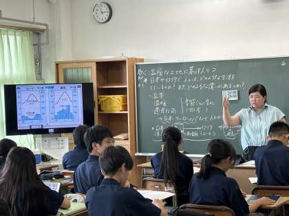 比較する! 公開日 2024/09/04 更新日 2024/09/04 おしらせ 1年生の社会科の授業では、様々な都市でのくらしの違い等を、気温や降水量等を基に学習していました。 授業では、どの部分に着目して考えればいいかを、先生がヒントを出しつつ、生徒たちに考えさせていました。 また、iPadで視覚的にしっかり比較できるのも、とても良いと感じました。 いいね(0)