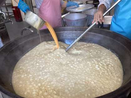 むらくも汁は、溶き流した卵が汁の中に広がり、それが空にたなびく「むらくも(群雲)」のように見えることからついた名前です。卵をふわふわと仕上げるために、水溶き片栗粉で汁にとろみをつけてから少しずつ卵を流し入れてつくります。