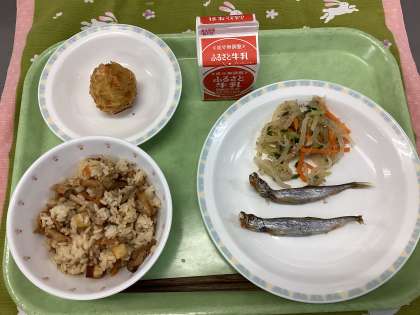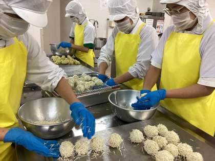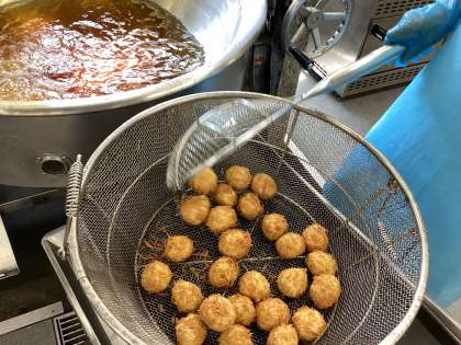 秋といえば栗の季節です。栗は「イガ」と呼ばれるするどいトゲのようなものに覆われています。この「イガ」がついた状態をイメージして作ったのが「いがぐり揚げ」です。蒸して潰したさつまいもを丸めてそうめんをまぶし、油で揚げて作りました。