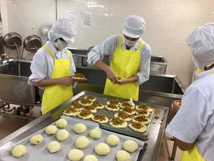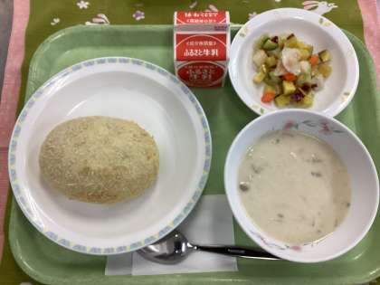 今日は2、3年生がいなくいつもより食数が少ないので、給食室でパン生地からこねたカレーパンを作りました。小麦粉から生地をこねて、発酵させて、一つ一つ具を包んでオーブンで焼きますが、パン生地は機械ではなく手でこねます。焼きたてのパンはとても柔らかくておいしかったです。