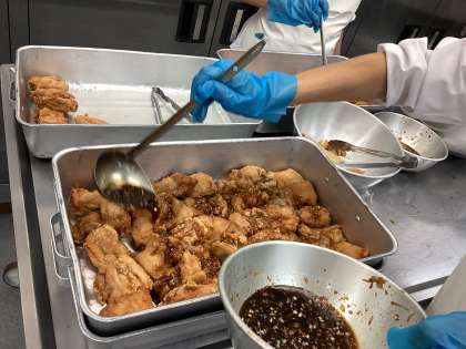 油淋鶏(ユーリンチー)は中華料理のひとつで、鶏の唐揚げにねぎが入った甘酢ダレをかけた料理です。今日は欠席者が多いクラスがいくつかあったのですが全然残らず、どのクラスもおかわりじゃんけんが盛り上がっていました。