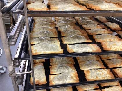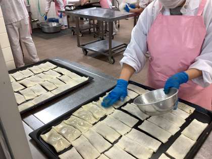 棒餃子は、餃子の具を特注の四角い餃子の皮で折りたたんで棒状に包んだものを、オーブンでパリパリに焼きあげて作ります。