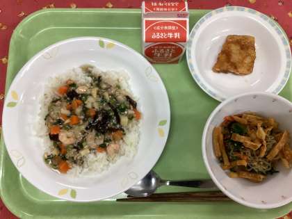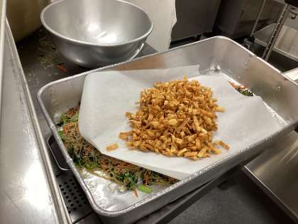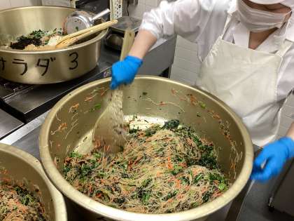 今日のサラダは、春雨と小松菜とひじきの煮物を合わせたサラダの上に、揚げたワンタンの皮をトッピングしたものです。ワンタンがカリカリのまま教室まで届くよう、食缶へはサラダの上にシートをのせて、その上にワンタンの皮をのせて配缶しました。カリカリの食感がアクセントとなり生徒からも人気の高いサラダです。