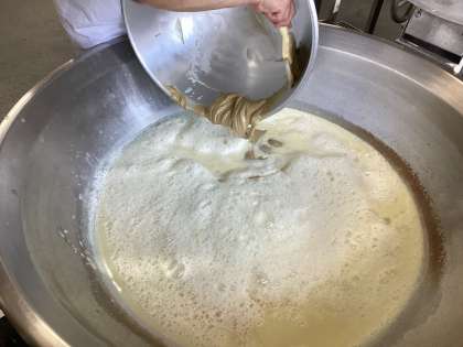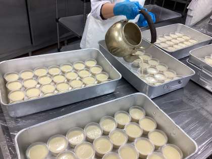 デザート白ごまプリンは、プリンといっても卵は使っていません。練りごま、豆乳、砂糖を合わせたものを、寒天で固めて作りました。小さなごま粒にはたくさんの栄養がつまっていて、牛乳1本分と同じくらいのカルシウムが、スプーン2杯分のごまの中にあります。