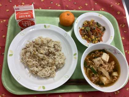 今日は韓国料理の献立です。コンナムルパブは、豆もやしと豚肉の炊き込みごはんです。チゲは韓国の家庭料理で、キムチ味+みそ味でいただく鍋物に近い料理です。