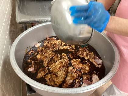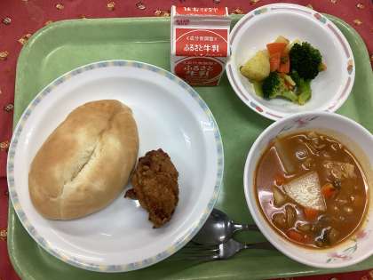 今日で2学期の給食が最後なので、一足早くクリスマス献立です。メインはみんなが大好きなフライドチキン、サラダのブロッコリーはもみの木のイメージで、またミネストローネに入っているマカロニは星形を使い、クリスマスらしい献立にしました。