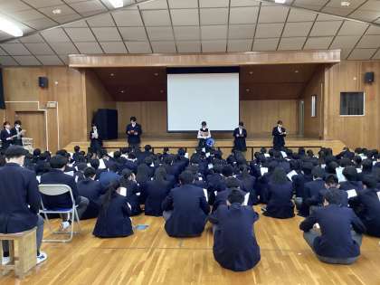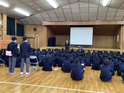 ※写真は校外学習前日の学年集会の様子です。それぞれの生徒が自分の役割をしっかり果たそうと行動していました。