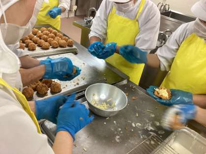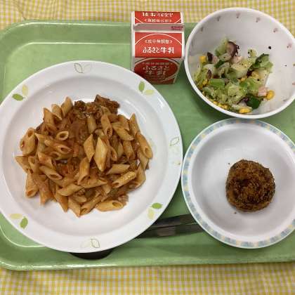 学校給食週間最終日の献立はイタリア料理です。アマトリチャーナはローマを代表するパスタソースで、トマトをたっぷり使っています。アランチーニは、イタリア名物のライスコロッケです。ごはんにトマト味の具とチーズを混ぜて丸めて衣をつけて、油で揚げて作ります。