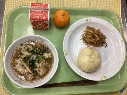 ボロボロジューシーは沖縄県の料理です。沖縄の言葉で「ボロボロ」は雑炊、「ジューシー」は炊き込みご飯という意味で、おじやのような料理です。今日の肉まんは、小麦粉を練って生地を作るところから給食室でひとつひとつ手作りしました。肉まんを作る作業はとても大変で時間がかかるため、ひと学年いない日にしか作れないスペシャルメニューです。